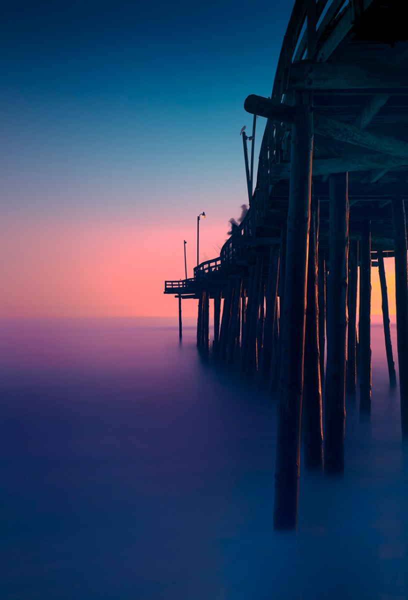 Outer Banks FIshing Pier Sunrise, 90 second exposure with the 35mm lens. Exposure: 90 seconds, f/16, ISO 200, 10 stop ND filter.