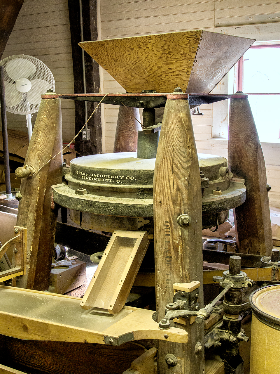 I quickly shooed all of the workshop participants out to set up and grabbed my own gear and jumped to a good location.  After a minute or so they unlocked the wheel and it started to turn.  I watched them carry large bags of corn into the building and smiled as I realized that they planned to actually grind some corn mill also.   All in all we spend about 2 hours there while the mill spilled water and churned out corn.  To the right is an example of a small mill setup for grinding corn or wheat.  This is not from the Berry Mill as it was much too dark and crowded for me to actually get a image of the mill grinding corn.  I did however purchase a bag of the ground corn which I have at home in my pantry right now!