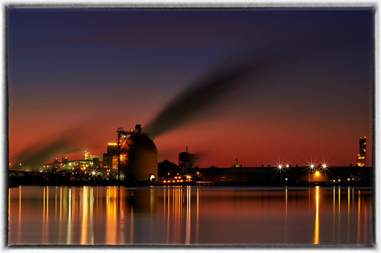 With the sun totally gone and deep into twilight, I simply turned the camera 90 degrees to the right and looked at the industrial complex across the bay with great columns of smoke spewing into the sky!  I removed the 3 stop solid ND and kept the soft Graduated ND in place to further darken the sky. So the resulting image was a 240 second exposure and full of color, smooth water and blowing smoke: