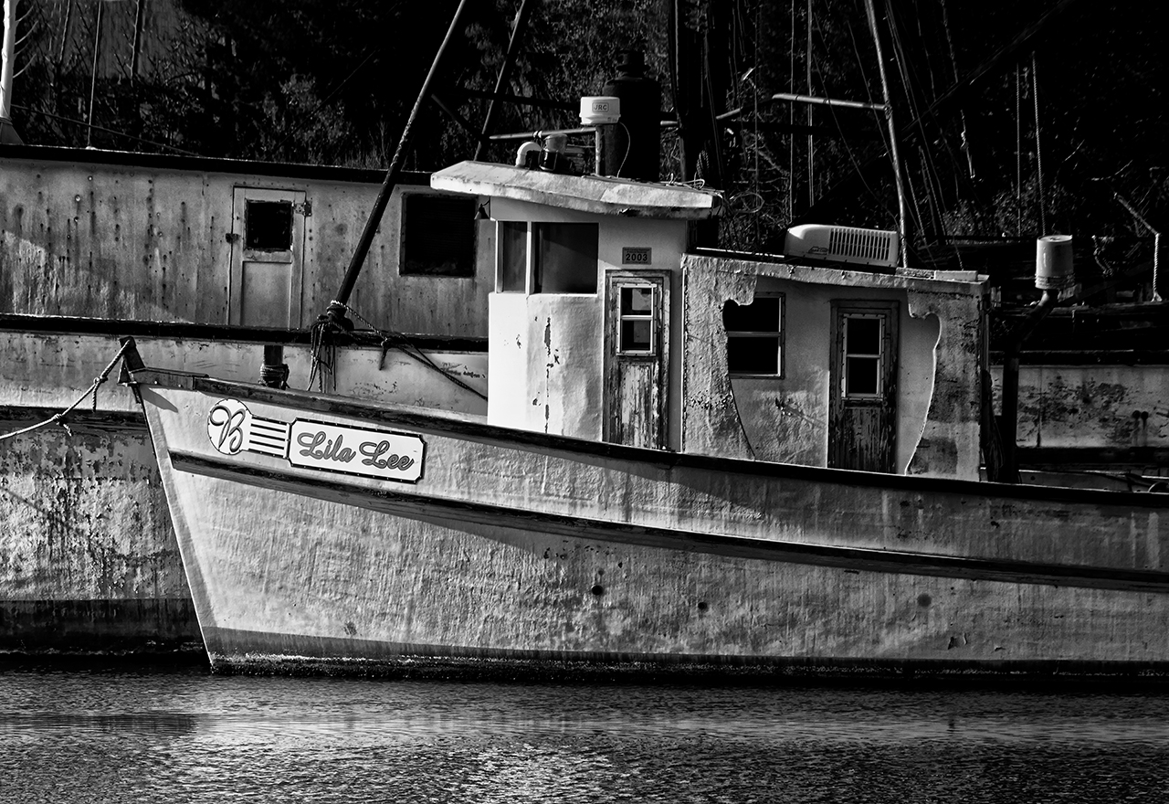 Here captured in Black and White, is a detail shot of the shrimper Lila Lee.  She is resting in the boat grave yard in Georgetown, SC. The older shrimpers seem to be abandoned along the shore here in Georteown till they sink.  We have some sitting on the bottom growing trees and weeds from their decks.